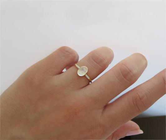 14k Gold 6x8mm Oval Rainbow Moonstone Ring with Diamond Accents