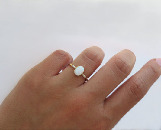 14k Yellow Gold 6x8mm White Fire Opal Ring with Diamond Accents